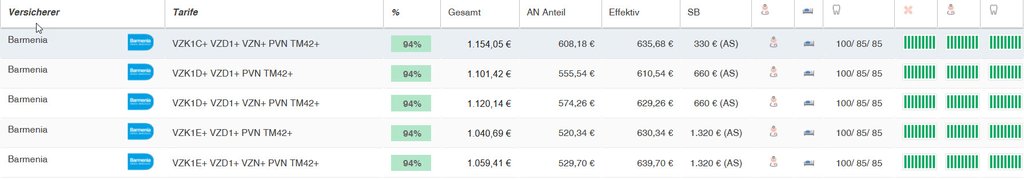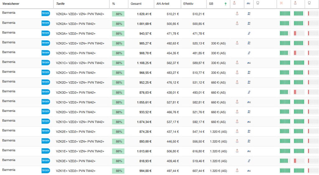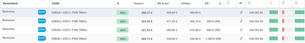 Hier sehen Sie eine Übersicht der Barmenia Zahnärztetarife für einen 38 jährigen Zahnarzt (inkl. 150 EUR Krankentagegeld ab 43. Tag) mit Angabe der Leistungsstärke. Der leistungsstärkste Zahnarzttarif private Krankenversicherung steht oben. Der Vergleich wurde mit dem Programm Levelnine erstellt.