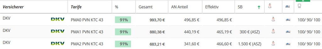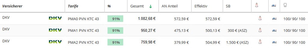 Hier sehen Sie eine Übersicht der DKV Ärztetarife PMA1, PMA2 und PMA3 für einen 38 jährigen Humanmediziner (inkl. 150 EUR Krankentagegeld ab 43. Tag) mit Angabe der Leistungsstärke. Der leistungsstärkste Arztetarif private Krankenversicherung steht oben. Der Vergleich wurde mit dem Programm Levelnine erstellt.