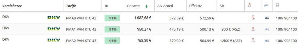 Hier sehen Sie eine Übersicht der DKV Ärztetarife PMA1, PMA2 und PMA3 für einen 38 jährigen Humanmediziner (inkl. 150 EUR Krankentagegeld ab 43. Tag) mit Angabe der Leistungsstärke. Der leistungsstärkste Arztetarif private Krankenversicherung steht oben. Der Vergleich wurde mit dem Programm Levelnine erstellt.