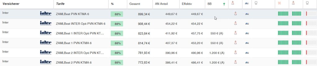 Hier sehen Sie eine Übersicht der Inter Zahnärztetarife ZAML Best für einen 38 jährigen Zahnarzt (inkl. 150 EUR Krankentagegeld ab 43. Tag) mit Angabe der Leistungsstärke. Der leistungsstärkste Zahnarzttarif private Krankenversicherung steht oben. Der Vergleich wurde mit dem Programm Levelnine erstellt.
