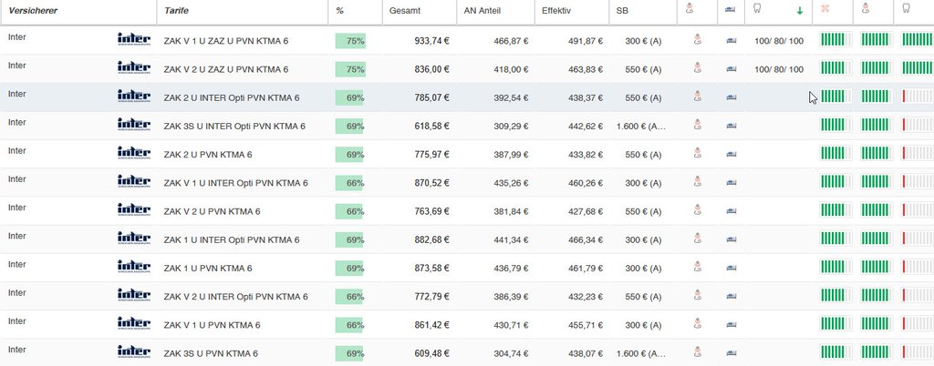 Hier sehen Sie eine Übersicht der Inter Zahnärztetarife ZA Best für einen 38 jährigen Zahnarzt (inkl. 150 EUR Krankentagegeld ab 43. Tag) mit Angabe der Leistungsstärke. Der leistungsstärkste Zahnarzttarif private Krankenversicherung steht oben. Der Vergleich wurde mit dem Programm Levelnine erstellt.