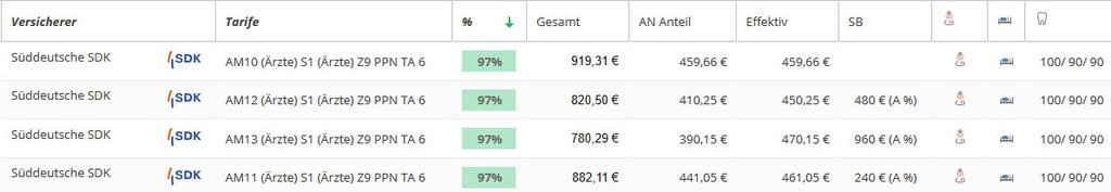 Hier sehen Sie eine Übersicht der SDK Ärztetarife für einen 38 jährigen Humanmediziner (inkl. 150 EUR Krankentagegeld ab 43. Tag) mit Angabe der Leistungsstärke. Der leistungsstärkste Arztetarif private Krankenversicherung steht oben. Der Vergleich wurde mit dem Programm Levelnine erstellt.