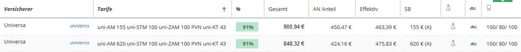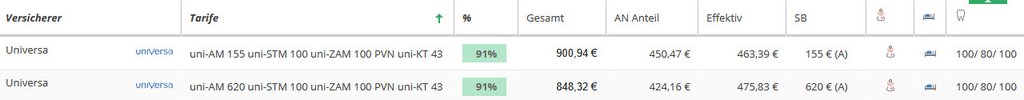 Hier sehen Sie eine Übersicht der Universa Tarife für Ärzte / Zahnärzte für einen 38 jährigen Arzt (inkl. 150 EUR Krankentagegeld ab 43. Tag) mit Angabe der Leistungsstärke. Der leistungsstärkste Ärztetarif private Krankenversicherung steht oben. Der Vergleich wurde mit dem Programm Levelnine erstellt.