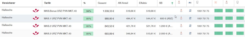 Hier sehen Sie eine Übersicht der Hallesche Krankenversicherung Zahnärztetarife MAS Bonus und MAS 1-3 für einen 38 jährigen Zahnarzt (inkl. 150 EUR Krankentagegeld ab 43. Tag) mit Angabe der Leistungsstärke. Der leistungsstärkste Zahnarztetarif private Krankenversicherung steht oben. Der Vergleich wurde mit dem Programm Levelnine erstellt.