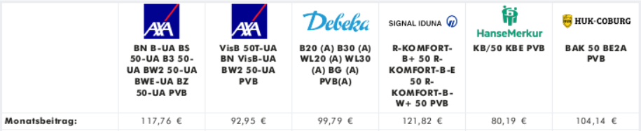 | Monatsbeitrag | 117,76 € | 92,95 € | 99,79 € | 121,82 € | 80,19 € | 104,14 € |