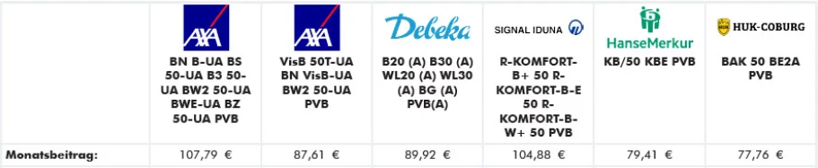 | Kein tarifliches Preis- u/o Leistungsverzeichnis/ keine Anlehnung an Beihilfe | ❌ | ❌ | ❌ | ❌ | ✅⚠️ | ❌ |